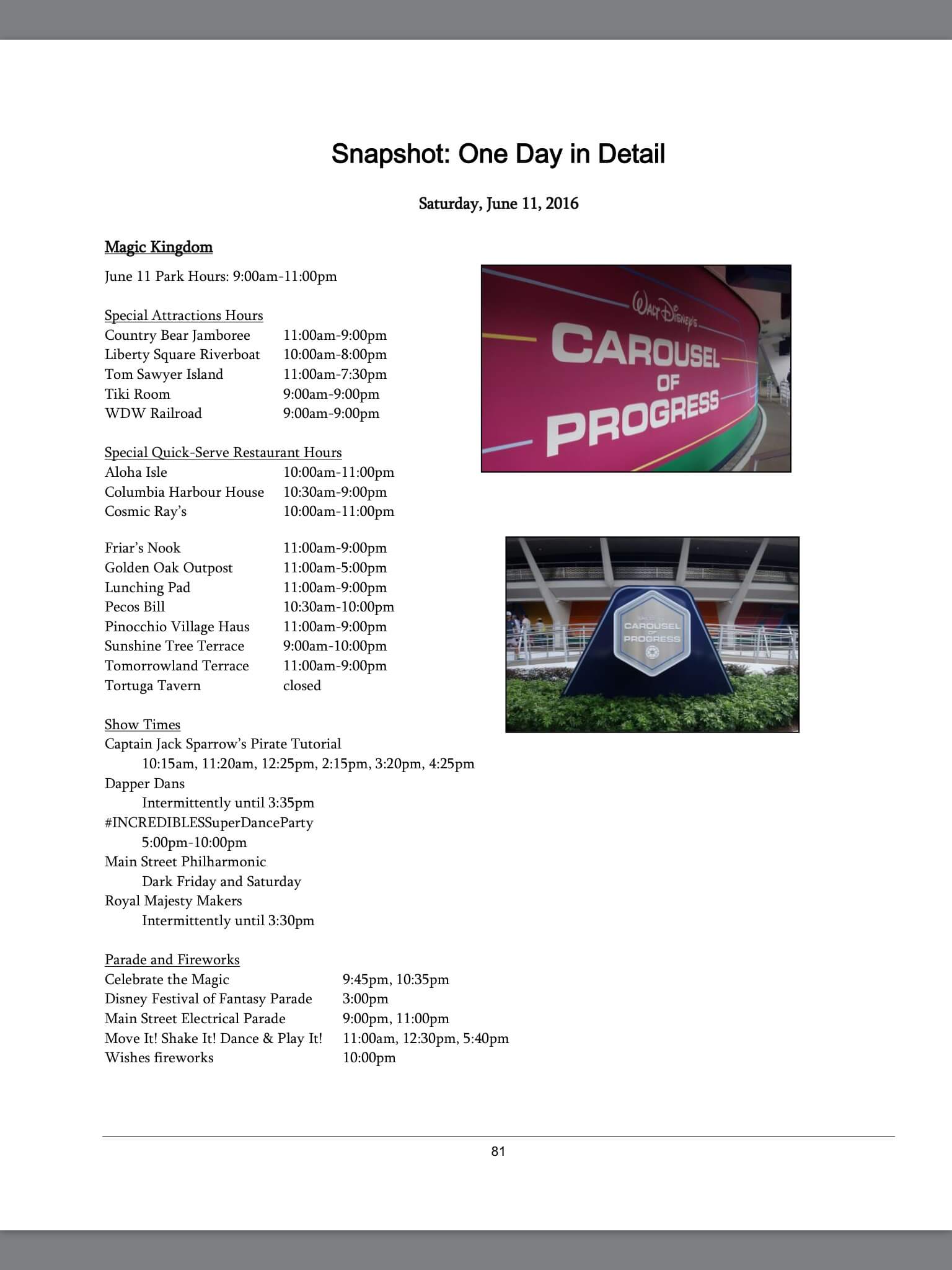 There are some great appendices at the end of the ‘Earbook. Yee lists all of the groups that played at Epcot. He also lists the food and prices at all of the booths at the Epcot Food and Wine Festival. Yee even created a snapshot of one full day during the summer at all the parks. He gives us the operating times, the entertainment times and a look at some of the food prices.