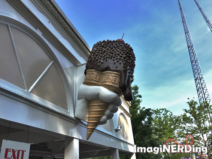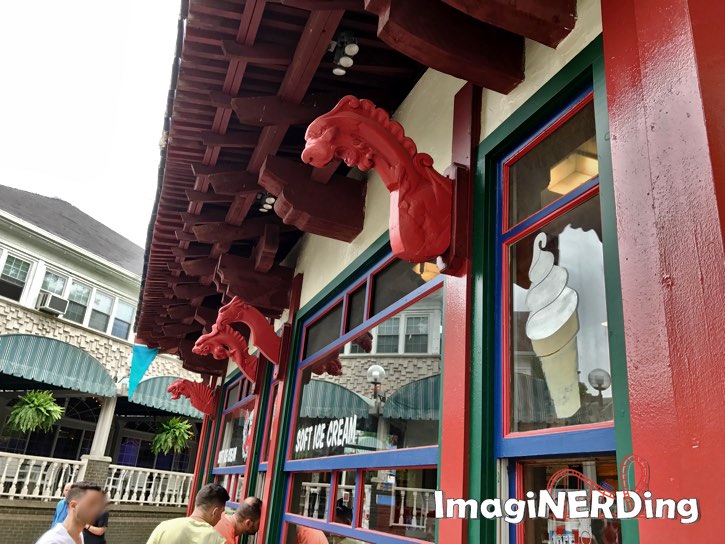The Kennywood Pagoda sells ice cream, Dole Whips, sausages and more. The dragon heads on the building are from the Old Mill ride vehicles.