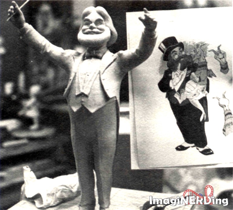 Dreamfinder, host of the Journey into Imagination Pavilion in Epcot Center,nears the final approval stage in the Sculpture Shop. Pictured in the upper-left corner is the full-scale clay model, which recently took on a whole new look as fittings were made for his wardrobe.