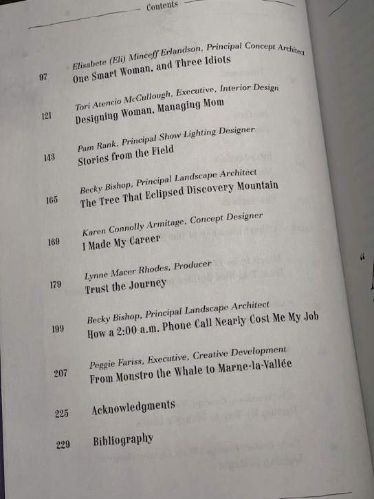 The 12 imagineers in the book span decades of Disney theme park history. The majority worked on the more recent projects, like Disneyland Paris, but a few spent years on Disneyland projects and the fledgling Walt Disney World. Interspersed in the reflections are tales of working with Disney legends and learning from the masters. Then, the authors share how they broke through the glass ceiling through hard work, perseverance, and diligence.